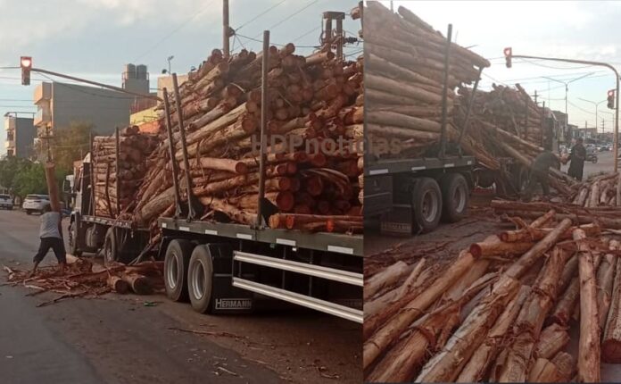 Un Ford Cargo con acoplado colmado de tronco de raleo de pino casi provoca una tragedia en la avenida Castelli, en la zona sur de Resistencia.